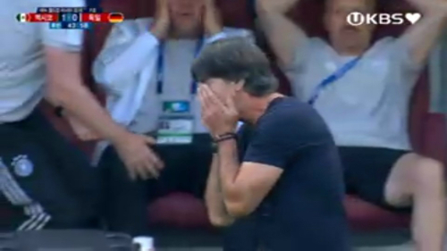 | 뢰프 독일감독이 멕시코에 1-0 패배 후 얼굴을 감싸안고 있는 모습 |