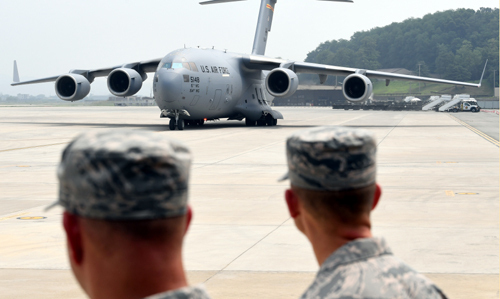 | 오산기지 도착 주한미군 장병들이 27일 오전 북한 원산 갈마비행장에서 6·25전쟁 미군 전사자 유해를 싣고 경기 평택 소재 오산 미 공군 기지에 도착한 C-17 글로브마스터Ⅲ 수송기를 바라보고 있다. 오산=사진공동취재단 |