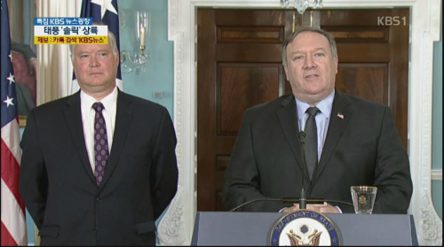 | 마크 폼페이오(오른쪽) 미국 국무장관이 23일(현지시간) 미국 워싱턴의 국무부 청사에서 대북 실무를 총괄할 대북특별대표로 스티븐 비건(왼쪽) 포드자동차 부회장을 선임한 사실과 다음주 초 함께 평양으로 들어간다고 발표하고 있다. 27일이나 28일쯤 4번째 방북할 폼페이오 장관은 김정은 국무위원장과 만날 계획은 없다고 했다. 사진=KBS 캡처 |