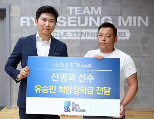 사단법인 두드림스포츠의 유승민 IOC(국제올림픽위원회) 위원이 장애인체육회 소속 신명국 탁구선수와 엘리트꿈나무선수에게 장학금 전달식을 갖고 격려했다.