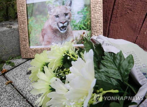 | 20일 대전 오월드 입구에 퓨마 뽀롱이를 추모하는 조화와 사진, 메모지가 놓여있다. |