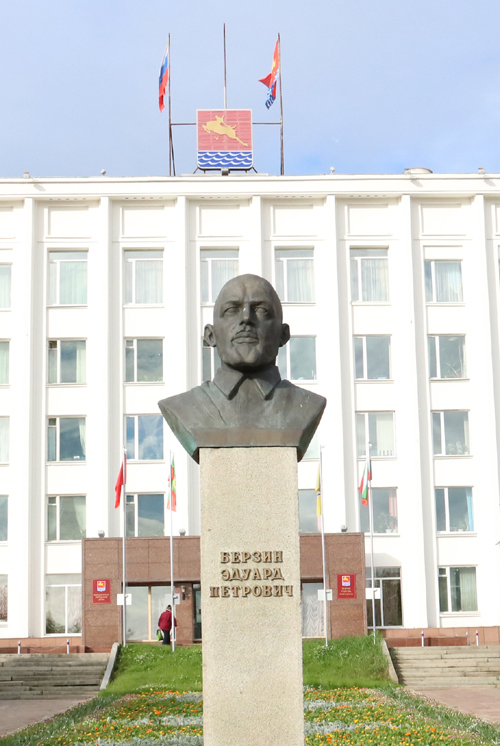 | 레닌 동상 뒤에 서있는 마가단 주청사. |