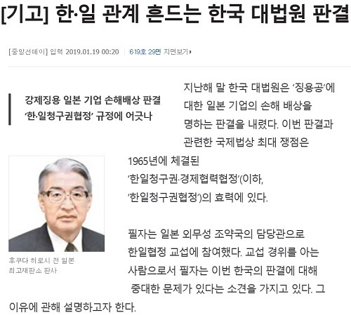 | 정통 외교관 출신 후쿠다 히로시 전 일본 대법관이 한국 대법원의 일제 강제징용 판결을 정면으로 비판하는 글을 국내 언론에 기고했다. 중앙일보 홈페이지 캡처 |