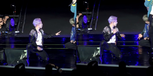 방탄소년단 지민이 무대 바닥이 미끄러우니 다른 멤버들에게 안무부분을 변경하자고 손짓으로 전하고 있는 모습.