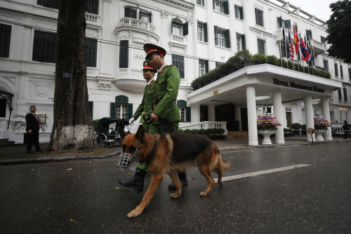 | 제2차 북미정상회담 일정이 시작된 27일 베트남 하노이 메트로폴 호텔 앞에서 공안이 경비견과 함께 주변 경계 순찰을 하고 있다. |