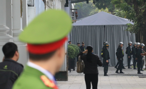 | 제2차 북미정상회담이 시작된 27일(현지시간) 회담장인 베트남 하노이 메트로폴 호텔 입구에 천막이 쳐져있다. |