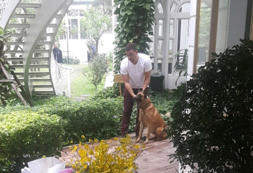| 26일 오전 북미 정상회담장으로 꼽히는 소피텔 레전드 메트로폴 하노이 호텔에서 미국측 경호원으로 추정되는 인물이 폭발물 탐지견과 함께 있는 모습. |