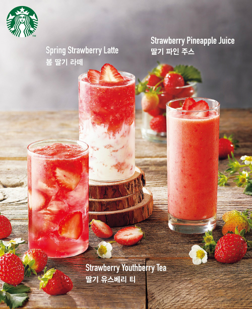 딸기와 아가베 시럽, 우유가 어우러진 '봄딸기 라떼'와 스타벅스 '시그니처' 차인 유스베리(Youthberry)와 딸기가 만난 '딸기 유스베리 티', 딸기와 파인애플의 조화를 유도한 '딸기 파인 주스' 3종으로 준비됐다.