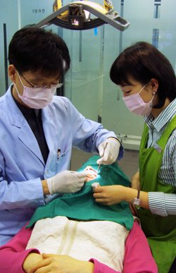 | ◇치과 전문의가 환자를 진료하고 있다. 치과 환자 가운데는 보철물을 씌운 후 치아관리를 제대로 하지 않아 치통 등을 호소하는 수가 적지 않은 만큼 보철을 씌운 후 올바른 칫솔질 등 사후 관리가 중요하다. |