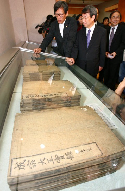 | ◇2006년 서울대 규장각에서 열린 조선왕조실록 오대산사고본 인수인도식이 끝난 뒤 정운찬 전 총장과 유홍준 전 문화재청장이 사고본을 둘러보고 있다. 조선왕조실록은 태조에서 철종까지 조선시대 25대 472년(1392∼1863)의 역사를 편년체로 기록한 방대한 역사서이다. 조선시대 사회, 경제, 문화, 정치 등 다방면에 걸쳐 기록된 공식 국가기록이기도 하다. |