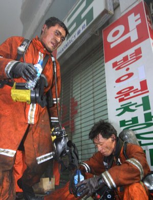 | '화마가 쓸어버린 아비규환의 현장을 빠져나와 물 한 모금으로 검댕이 가득 고인 목을 적신다. 혹시 누군가의 가냘픈 외침을 못들은 건 아닐까. 물맛이 쓰다. 다시 그곳으로 돌아가야 한다.' 2003년 대구 지하철 화재 참사 구조현장에서 두 소방관이 녹초가 된 채 한숨을 돌리고 있다. /김중태 문화원 제공 |