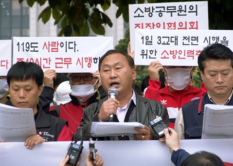 | ◇현직 소방관과 ‘소방공무원을 사랑하는 모임’ 등 민간단체 회원들이 2007년 11월9일 서울 세종로 정부중앙청사 앞에서 근로시간 단축 등을 요구하며 시위하고 있다. 소방발전협의회 제공 |