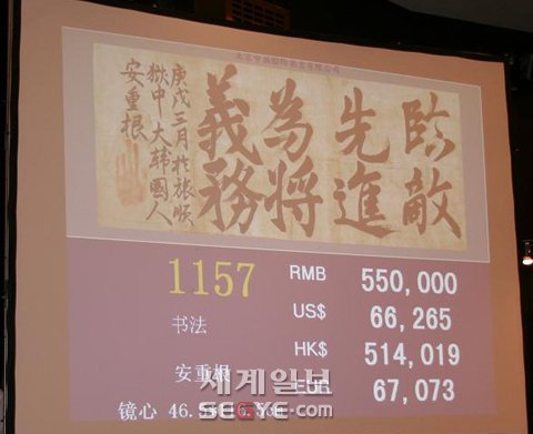 21일 중국 베이징의 아시아호텔에서 열린 예술품 경매회사인 중파이(中拍)국제 경매에서 안 의사의 옥중휘호라고 주장하는 작품이 최고 응찰가인 55만위안에 팔렸다. 당초 경매 시작 가격으로 고시된 50만위안(7500만원)보다 낮은 42만위안(6300만원)에서 시작된 경매는 4∼5명이 참여했으며 비공개로 입찰한 인물에게 55만위안에 낙찰됐다.