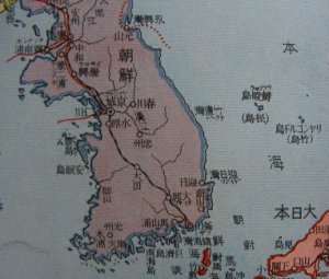 | ◇일제강점기 일본에서 발간한 ‘소학국사회도’에 표기된 지도에 독도가 한반도, 울릉도와 같은 회청색으로 표시돼 있다. |