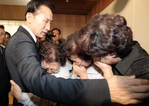 | 李대통령 유족들 위로 이명박 대통령이 20일 서울 은평구 대조동의 한 나이트클럽에서 발생한 화재를 진압하다 순직한 소방관들의 합동분향소가 마련된 신촌 세브란스병원 장례식장을 찾아 유족들을 위로하고 있다. /연합뉴스 |