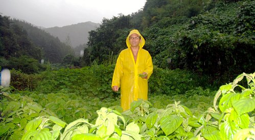 | ◇어머니 간식거리인 깻잎 전을 만들기 위해 전희식씨가 비가 내리는 가운데 텃밭에서 자연농법으로 키운 깻잎을 따고 있다. |