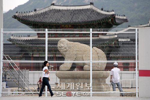 문화재청은 광화문 복원공사 현장 전체를 철제 가림막으로 가렸지만, 해태상이 놓여 있는 부분은 철망으로 만들어 시민들이 이를 볼 수 있게 만들었다.