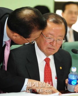 | 답변 어떻게… 6일 과천 정부청사에 열린 기획재정부 국정감사에서 강만수 장관이 실무자와 답변 내용에 관해 얘기하고 있다. 남제현기자 |