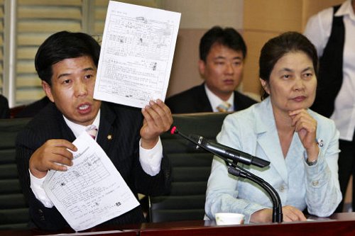 | “이름이 없는데…” 민주당 백원우 의원(왼쪽)이 14일 서초구청을 방문, 구청 측이 제시한 이봉화 보건복지가족부 차관의 쌀 소득보전 직불금 신청 포기서에 이 차관의 이름 등이 명기되지 않았다며 급조 의혹을 제기하고 있다. 연합뉴스 |