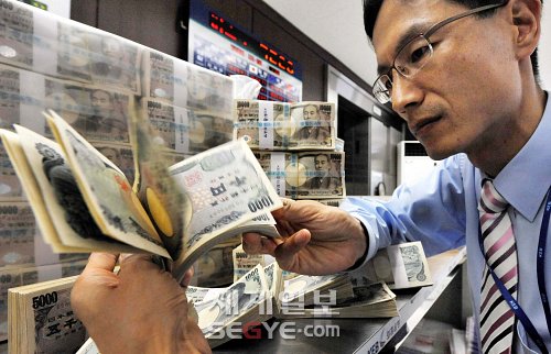 | ◇오랜만에 원·엔 환율이 내린 28일 서울 명동 외환은행 본점에서 한 직원이 심각한 표정으로 엔화를 세고 있다. 전신 인턴기자 |