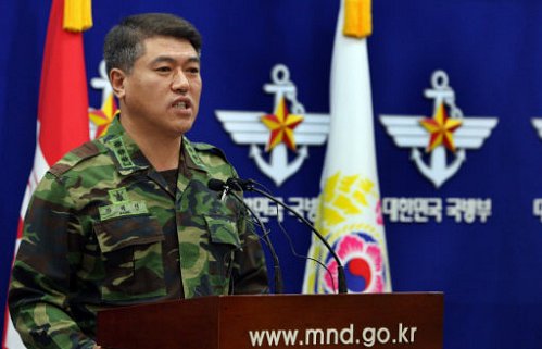 | ◇23일 서울 용산 국방부 브리핑실에서 강덕찬 육군본부 공보과장이 강원도 철원 육군 GP 내무반에서 발생한 수류탄 폭발 사고에 대해 설명하고 있다. 연합뉴스 |