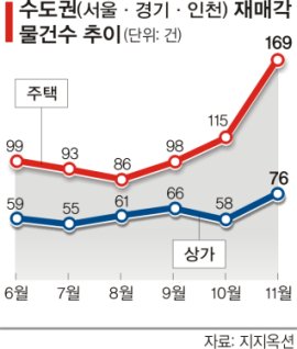 11월 한 달간 수도권에서 재매각(낙찰대금 미납으로 다시 경매에 부쳐지는 것) 물건 수는 주택 169건, 상가는 76건에 이른다.