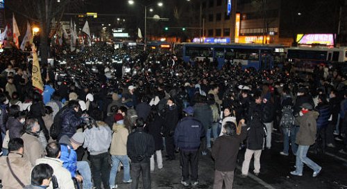| 경찰과 대치 전국철거민연합회 회원 등 시민 1000여명이 20일 오후 참사가 발생한 용산구 한강로2가 재개발지역 4층 건물 앞에서 추모집회 후 도로를 점거한 채 경찰과 대치하고 있다. 연합뉴스 |