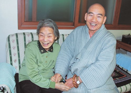 | ◇혜승 스님이 양주시청 근처에 있는 연화요양원에 들러 이곳에서 생활하는 극락화(95) 보살의 손을 잡으며 “노보살님이 불교공부에 어찌나 열심이신지 법화경 박사 가 됐다”고 환하게 웃고 있다. |