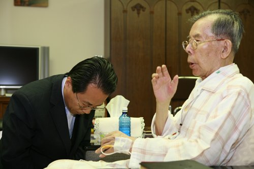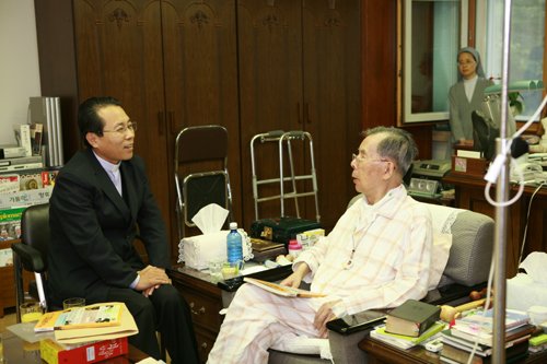 | ◇김수환 추기경이 2008년 5월 21일 서울 종로구 혜화동 추기경 집무실에서 '월간 사목정보'와 인터뷰를 한 후 주간인 차동엽 신부를 강복해주고 있다. 김 추기경이 입원하기 전에 찍은 건강한 모습의 마지막 사진이다. 왼쪽 손등에 꽂은 링거바늘이 당시의 병세를 짐작케한다. <사진 제공=미래사목연구소> |