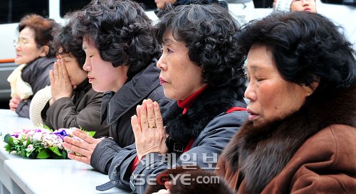 | 간절한 추모기도 김수환 추기경 선종 나흘째인 19일 서울 명동 가톨릭회관의 성모마리아 상 앞에서 조문객들이 추모 기도를 드리고 있다. 이종덕 기자 |