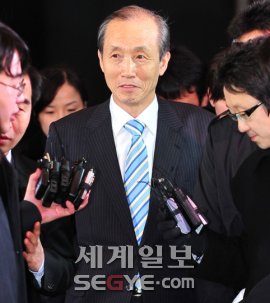 | 퇴근길 답변 신영철 대법관의 이메일 파문과 관련해 6일 저녁 이용훈 대법원장이 퇴근하면서 기자들의 질문에 답하고 있다. 이종덕 기자 |