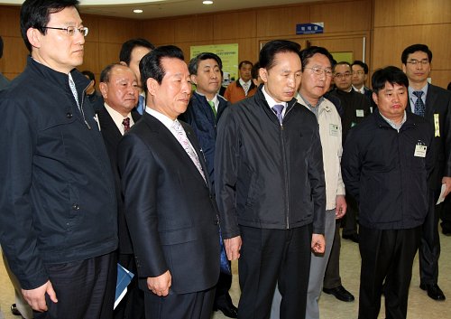 | ◇이명박 대통령이 9일 서울 문래동 서울신용보증재단을 방문해 현황을 보고 받고 있다. 연합뉴스 |