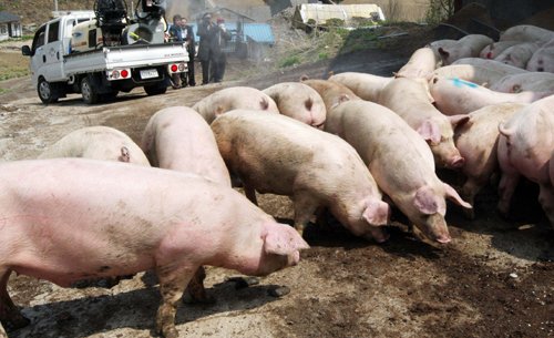 | 축사 소독 지구촌을 강타한 돼지인플루엔자의 국내 감염에 대비해 27일 강원 춘천시 한 농가에서 시청 방역차량이 돼지축사 주변을 소독하고 있다. 춘천=연합뉴스 |