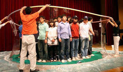 | ◇지난 16일 대전 서구 도마동 배재대에서 열린 ‘비눗방울 속에 사람 많이 넣기’ 도전 행사에 나선 박경숙씨(오른쪽)가 지름 4.75m의 원기둥 안에 사람 90명을 넣고 있다. 대전=연합뉴스 |