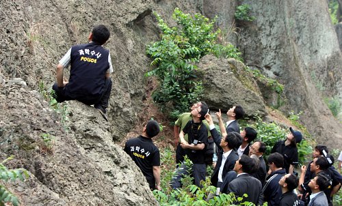 | ◇노무현 전 대통령 서거 경위를 수사 중인 경찰이 2일 경남 김해 봉화산 부엉이바위 아래에서 당시 상황을 재연하는 현장검증을 하고 있다. 김해=연합뉴스 |
