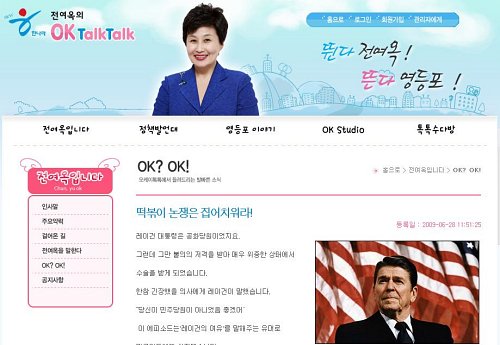 전 의원은 28일 홈페이지( www.oktalktalk.com)에 ‘떡볶이 논쟁은 집어치워라’라는 제목의 글을 올려 “이명박 대통령의 시장방문을 두고 민주당의 모 의원이 ‘떡볶이집 망하고∼’라는 ‘망하고 송’을 불렀는데 이는 한마디로 정치적 자살골이 분명하다”면서도 “상대가 완벽한 실책을 범했을 때는 정치적으로 건드리지 않는 것이 수”라고 말했다.