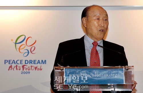 | ◇피스컵대회를 창설한 문선명 세계평화통일가정연합 총재가 24일 스페인 세비야 꿀뜨라스에서 진행된 피스드림 아트페스티벌 개막식에서 연설하고 있다. 세비야=이종덕 기자 |