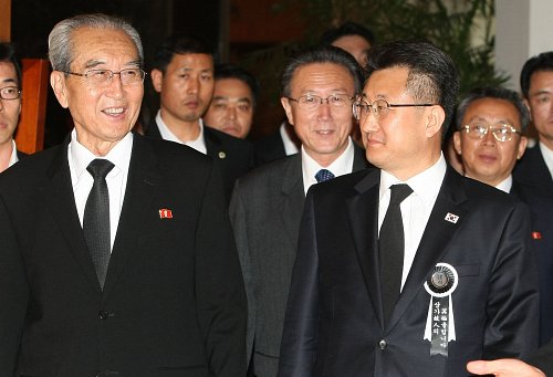 | 공항 향하는 北 조문단 김기남 북한 노동당 비서를 비롯한 북한 조문단이 홍양호 통일부 차관의 배웅을 받으며 23일 오전 숙소인 서울 홍은동 그랜드힐튼호텔을 떠나고 있다. <연합> |