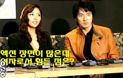 | 고(故) 장진영이 2007년 9월5일 열린 SBS 드라마 '로비스트' 기자회견에 송일국과 나란히 참석해 "여자로서 액션 연기가 힘들지 않았느냐"는 기자 질문에 답하고 있다. '로비스트'는 결국 장진영의 유작이 되고 말았다. |