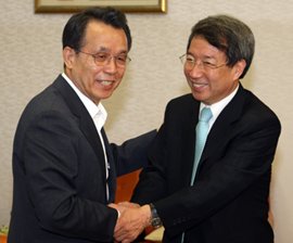 | ◇정운찬 국무총리 내정자(오른쪽)가 4일 오전 정부중앙청사 총리실을 방문해 한승수 총리와 반갑게 인사하고 있다. 연합뉴스 |