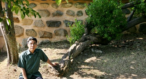 | ◇부산 수영사적공원 사철나무 와목(臥木) 곁에 앉은 최영철 시인. 한 여인이 찰나에 나무의 이마를 짚어주고 지나간 것이었는데, 그 기억을 못 잊어 나무가 그네의 향방을 좇아 몸을 눕혔다고 시인은 썼다. 그는 “사실 우리 삶이라는 건 큰 사랑이 지배하는 게 아니라 스쳐가는 것들로 채워진다”고 말했다. |