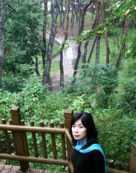 | ◇자미원 인근에서 하룻밤을 보낸 뒤 영월 청령포에 들렀다. 조용미 시인이 좋아하는 소나무들이 배경에서 비를 맞고 있다. |
