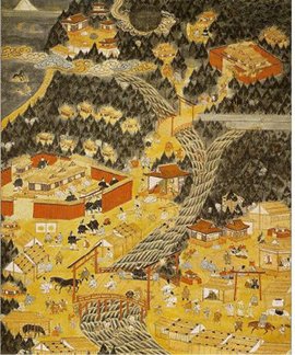 | ◇이세진구(伊勢神宮) 축제가 그려진 17세기쯤의 두루마리. 그림의 중간 왼쪽에 붉은 담으로 둘러싸인 커다란 건물이 태양의 여신을 받드는 농경신을 모신 외궁(外宮)이며, 오른쪽 상단에 조그맣게 위치한 것이 태양의 여신을 모신 내궁(內宮)이다. |