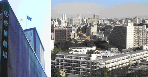| ◇(왼쪽)도쿄 한복판에 자리 잡은 ‘제국극장’ 위에 걸린 일장기. 제국(帝國)이란 단어와 반갑지만은 않은 조화를 이루고 있다. ◇(오른쪽)도쿄 신주쿠구 다카다노바 부근의 모습. 태양빛이 강한 일본에서는 가급적 정남향을 피해 집을 짓는다. 제각기 다른 각도로 동향에서부터 서향까지 태양을 바라보고 있는 맨션과 빌딩들이 이채롭다. |