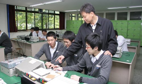 | ◇내년 3월 마이스터고로 전환하는 서울 강남구 개포동 수도전기공고 재학생들이 실습수업 시간에 교사의 설명을 듣고 있다. 수도전기공고 제공 |