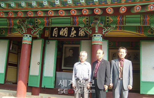| ◇안중근 의사의 ‘하얼빈 의거’ 100주년을 이틀 앞둔 24일 전남 장흥군 장동면 만년리 해동사를 찾은 안종구(왼쪽부터)· 안종복· 안경순씨. 해동사는 국내 유일의 안중근 의사의 사당이다. 해동사 중앙 현판 글씨 ‘해동명월’은 이승만 전 대통령이 직접 쓴 안 의사를 상징하는 휘호다. 장흥=장원주 기자 |