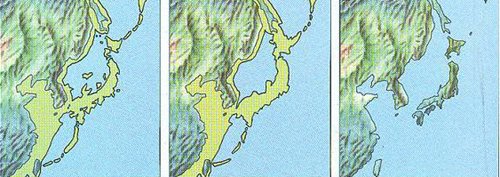 | ◇마지막 빙하기가 끝나갈 무렵, 한반도와 일본은 쓰시마를 통해 연결돼 있었다. 이후 지구온난화로 해수면이 높아지면서 일본은 대륙으로부터 떨어져 나갔다. |