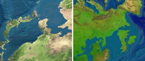 | ◇유럽의 북서쪽 끝에 위치하고 있는 영국에 해당하는 것이 아시아에서는 일본이다.(오른쪽) 동아시아의 지도를 180도 거꾸로 돌려보면, 한반도를 바라보는 일본의 위치가 영국과 비슷한 곳에 자리 잡고 있다.(왼쪽) 유럽의 지도를 180도 돌려보아도, 영국은 동아시아의 일본에 해당하는 위치에 배치된다. 참고로 영국의 좀 떨어진 왼쪽에 한국과 비슷한 모양으로 자리 잡고 있는 국가는 덴마크이다. |