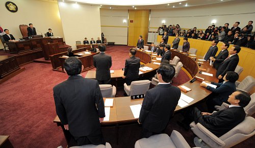 | ◇창원시의회 기립투표로 `마창진통합안' 의결 경남 창원시의회에서 11일 오전 `마산,창원,진해시 통합안에 대한 찬반의견 제출'에 대한 기립투표가 진행되고 있다. 이날 열린 열린 본회의에서는 시의원 20명 가운데 19명이 출석해 찬성 15명, 반대 4명으로 `마창진 통합안'을 찬성의결했다. <연합> |