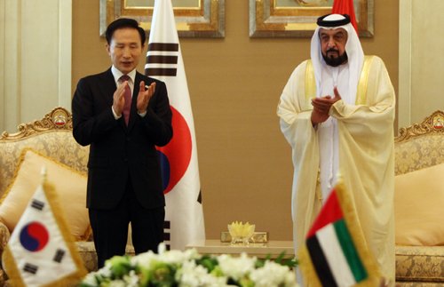 지난 26일 UAE 아부다비에 도착한 이명박 대통령은 27일 오후 에미리트 팰리스호텔에서 할리파 빈 자이드 알 나하얀 UAE 대통령과 정상회담을 갖고 한국전력 컨소시엄의 UAE 원전 수주를 최종 확정했다.